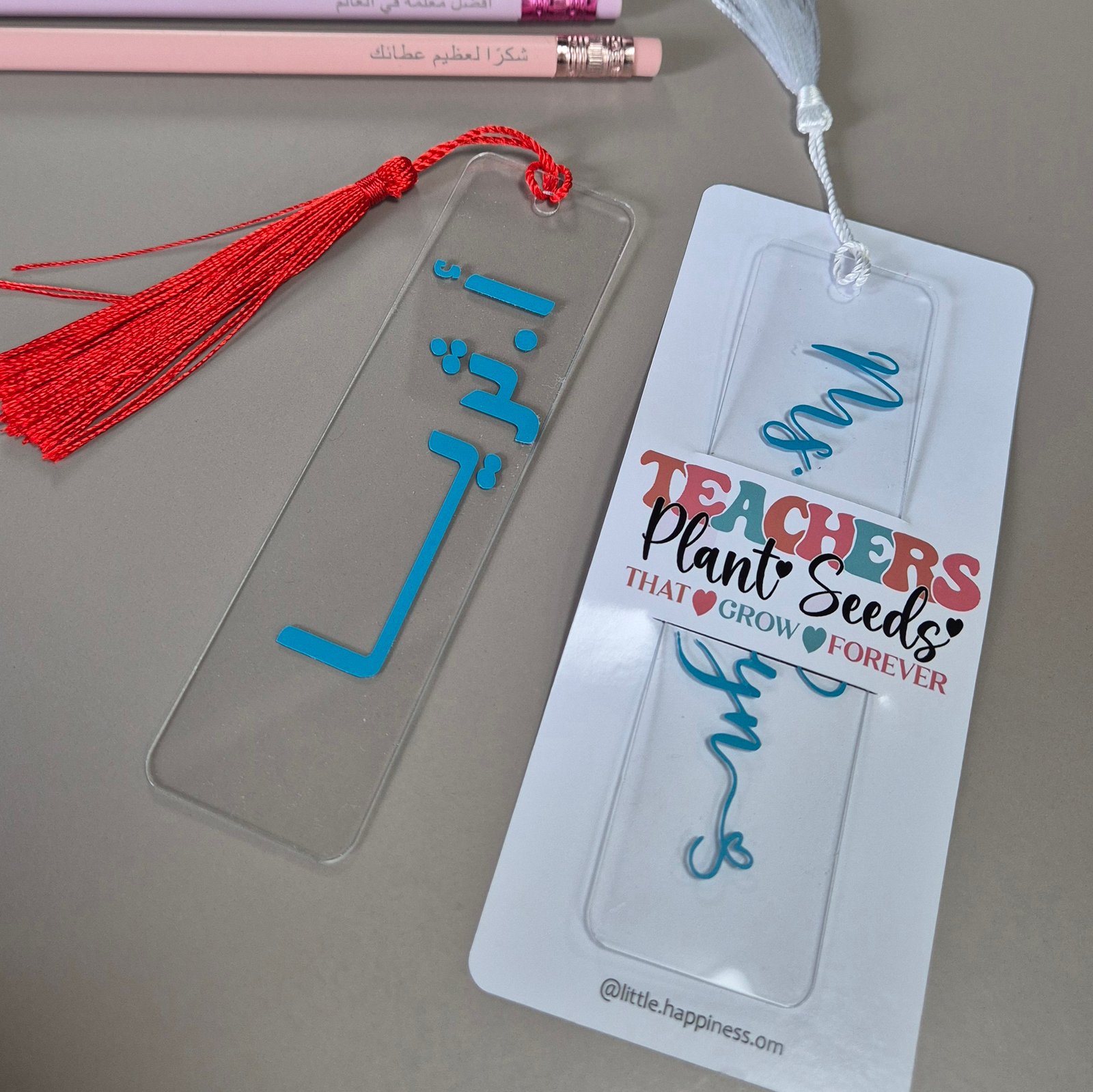 فاصل كتاب أنيق ومخصص باسم المعلم/ـة، هدية مثالية للتعبير عن الامتنان والتقدير في نهاية العام الدراسي أو في يوم المعلم.