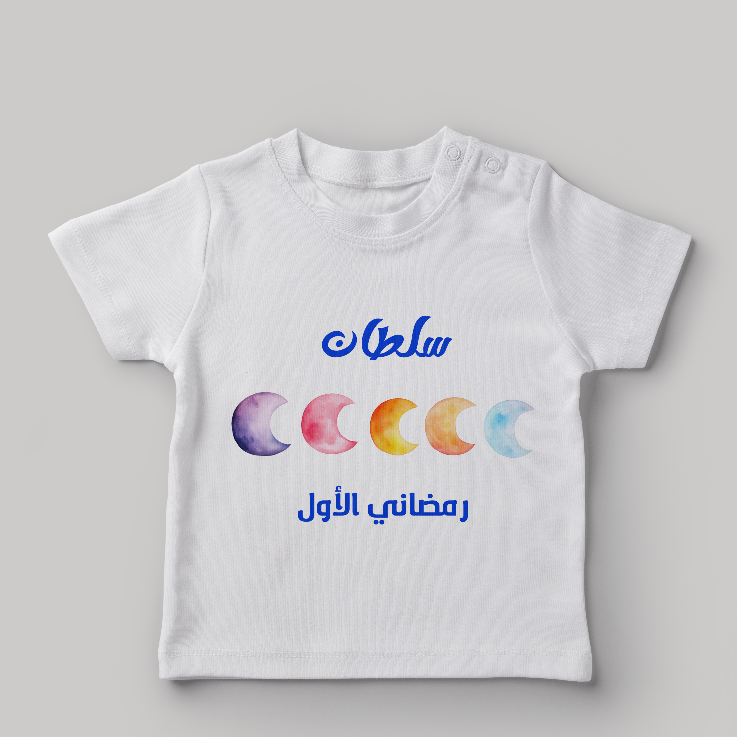 تيشيرت قطني ناعم ومريح، مصمم خصيصًا للاحتفال بأول رمضان لطفلك. خامته اللطيفة مناسبة لبشرة الأطفال، ويمنح إطلالة بسيطة وأنيقة تليق بأجواء الشهر الفضيل.
